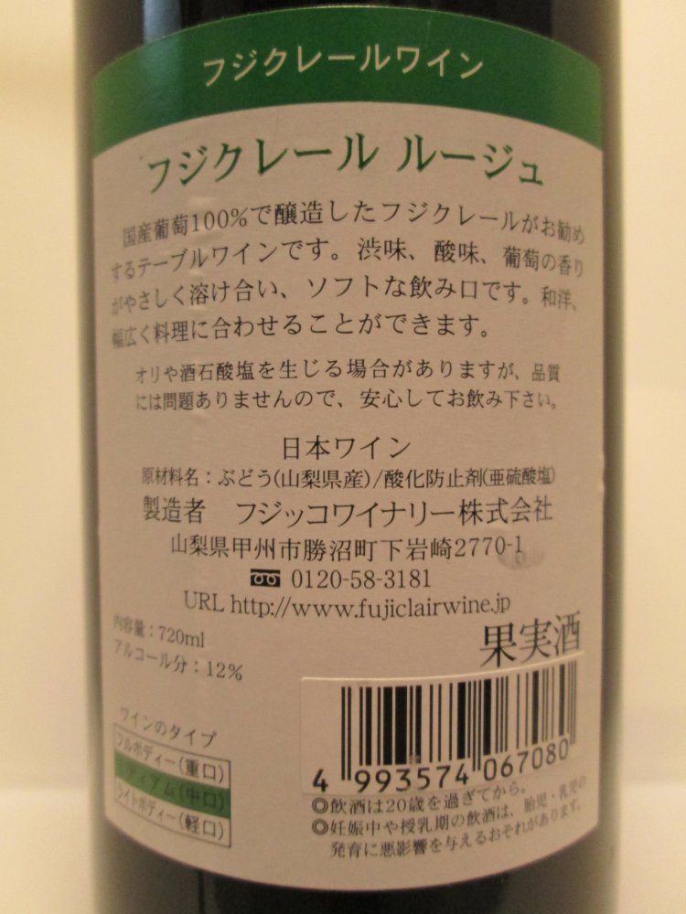 甲州ワイン(赤)「ルージュ」フジッコワイナリー株式会社製造